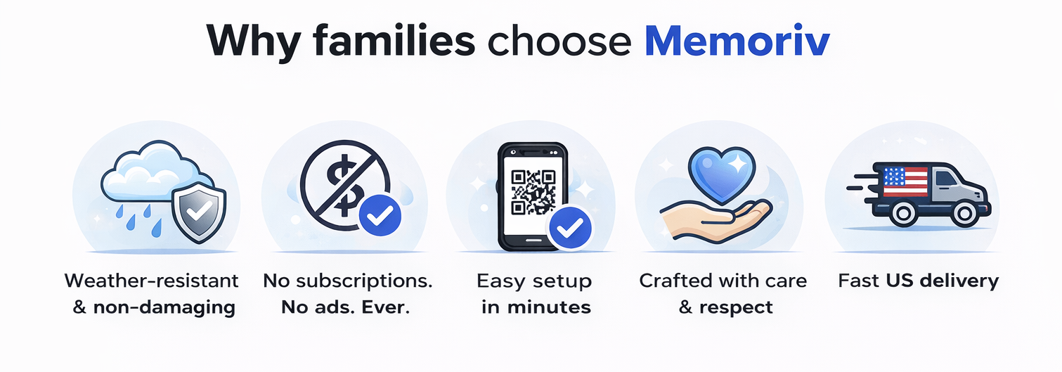 No, there’s no ongoing cost! We provide a one-time purchase option for a customizable memorial page, along with your choice of a silver or black aluminum medallion featuring a QR code. This service includes lifetime storage for up to 50 photos, unlimited videos, and text content for your online tribute. If you wish to add more photos in the future, additional storage is available through an annual subscription, allowing you to keep your loved one’s digital memorial current and comprehensive.